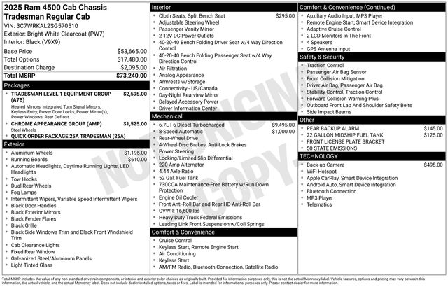 South Fork Chrysler Jeep Dodge Ram is very proud to offer this terrific-looking 2025 Ram 4500HD in Bright White Clearcoat. This vehicle has passed our comprehensive inspection and comes with the following features: 2025 4500HD Tradesman 19.5" x 6.0" Steel Wheels, 22 Gallon Midship Fuel Tank, Black Exterior Mirrors, Bright Front Bumper, Center Hub, Chrome Appearance Group, Chrome Grille Surround, Dual rear wheels, Exterior Mirrors Courtesy Lamps, Exterior Mirrors w/Heating Element, Exterior Mirrors w/Supplemental Signals, Front 1-Touch Down Power Windows, Manual Folding Exterior Mirrors, Manual Telescoping Mirrors, Matte Black Mesh Grille w/Chrome, Mirror Power Heat Fold Telescope Black, Mirror Running Lights, Power Adjust Mirrors, Power-Adjustable Convex Aux Mirrors, Quick Order Package 25A Tradesman, Rear Window Defroster, Remote Keyless Entry, Speed Sensitive Power Locks, Tradesman Level 1 Equipment Group, Trailer Brake Control, Trailer Light Check, Upgraded Door Trim Panel.