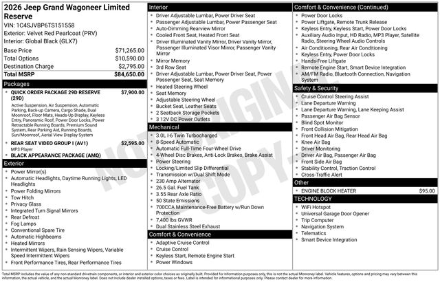 South Fork Chrysler Jeep Dodge Ram is pleased to offer this superb-looking 2026 Jeep Grand Wagoneer in Velvet Red Pearlcoat. This vehicle has passed our comprehensive inspection and comes with the following features: 2026 Grand Wagoneer Limited Reserve