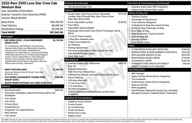 South Fork Chrysler Jeep Dodge Ram is very proud to offer this gorgeous-looking 2026 Ram 2500 in Ceramic Gray Clearcoat. This vehicle has passed our comprehensive inspection and comes with the following features: 2026 2500 Big Horn 12" Touchscreen Display, 2 Way Rear Headrest Seat, 2nd Row in Floor Storage Bins, 4 Way Front Headrests, 40/20/40 Split Bench Seat, 4G LTE Wi-Fi Hot Spot, 5th Wheel/Gooseneck Towing Prep Group, 9 Alpine Speakers with Subwoofer, Air Conditioning ATC with Dual Zone Control, Alexa Built-in, Anti-Spin Differential Rear Axle, Apple CarPlay, Apple CarPlay/Android Auto, Auto Power-Folding Mirrors, Auto-Dimming Rear-View Mirror, Big Horn Level 1 Plus Equipment Group, Black Exterior Mirrors, Black Exterior Truck Badging, Black Interior Accents, Black Wheel Center Hub, Body Color Grille-Surround, Clearance Lamps, Connected Travel and Traffic Services, Connectivity - US/Canada, Disassociated Touchscreen Display, Dual Glove Boxes, Emergency Vehicle Alert System (EVAS), Exterior Mirrors Courtesy Lamps, Exterior Mirrors with Heating Element, Exterior Mirrors with Supplemental Signals, Foam Bottle Insert (door Trim Panel), Folding Flat Load Floor Storage, Footwell Courtesy Lamp, For Details, Visit DriveUconnect.com, For More Info, Call 800-643-2112, Forward and Reverse Utility Lights, Front Armrest with Cupholders, Front Center Seat Cushion Storage, Front Seat Back Map Pockets, Global Telematics Box Module, Gloss Black Nostrils/Mic Black Grille, Glove Box Lamp, Google Android Auto, GPS Antenna Input, GPS Navigation, HD Radio, Integrated Voice Command with Bluetooth, LED Bed Lighting, Locking Lower Glove Box, Lone Star Badge, Luxury Steering Wheel, Manual Adjust 4-Way Front Passenger Seat, Mirror Running Lights, MOPAR Deployable Bed Step, MOPAR Spray in Bedliner, MyFlexCare Service Plan, Night Edition, Off-Road Info Pages, Painted Front Bumper, Painted Rear Bumper, ParkView Rear Back-Up Camera, Power 2-Way Driver Lumbar Adjust, Power Adjust 8-Way Driver Seat, Power Adjust Mirrors, Power Heated Folding Telescopic Mirrors, Power Telescoping Mirrors, Power-Adjustable Convex Aux Mirrors, Premium Cloth 40/20/40 Bench Seat, Quick Order Package 2UY Lone Star, Radio: Uconnect 5 Navigation with 12.0" Display, Rear 60/40 Folding Seat, Rear Dome with on/Off Switch Lamp, Remote Start System, Remote USB Port - Charge Only, Selectable Tire Fill Alert, SiriusXM Radio Service, SiriusXM with 360L, Steering Wheel Mounted Audio Controls, Storage Tray, Trailer Tow Pages, Wheels: 20" x 8.0" Black Painted Aluminum.