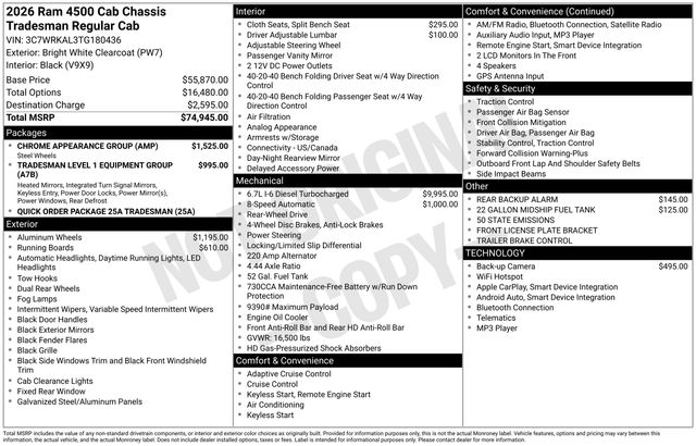 South Fork Chrysler Jeep Dodge Ram is very proud to offer this great 2026 Ram 4500HD in Bright White Clearcoat. This vehicle has passed our comprehensive inspection and comes with the following features: 2026 4500HD Tradesman 19.5" x 6.0" Steel Wheels, 22 Gallon Midship Fuel Tank, 52 and 22 Gallon Dual Fuel Tanks, Black Exterior Mirrors, Bright Front Bumper, Center Hub, Chrome Appearance Group, Chrome Grille Surround, Dual rear wheels, Exterior Mirrors Courtesy Lamps, Exterior Mirrors with Heating Element, Exterior Mirrors with Supplemental Signals, Front 1-Touch Down Power Windows, Manual Folding Exterior Mirrors, Matte Black Mesh Grille with Chrome, Mirror Power Heat Fold Telescope Black, Mirror Running Lights, Power Adjust Mirrors, Power-Adjustable Convex Aux Mirrors, Quick Order Package 25A Tradesman, Rear Window Defroster, Remote Keyless Entry, Speed Sensitive Power Locks, Tradesman Level 1 Equipment Group, Trailer Brake Control, Trailer Light Check, Upgraded Door Trim Panel.