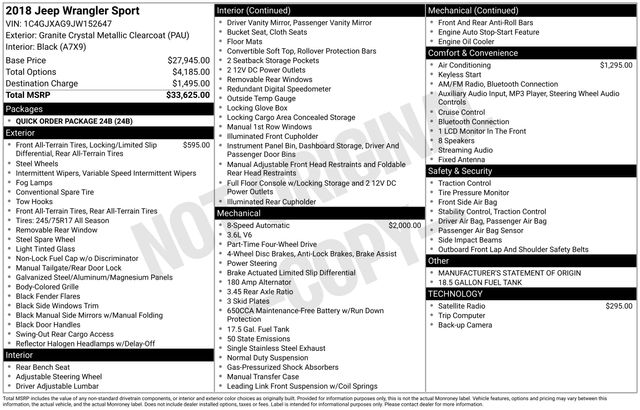 Whether you're exploring the great outdoors or navigating the daily commute, this 2018 Jeep Wrangler Sport is the perfect companion. With its impressive capabilities, thoughtful amenities, and striking good looks, it's a vehicle that's sure to turn heads and inspire adventure.