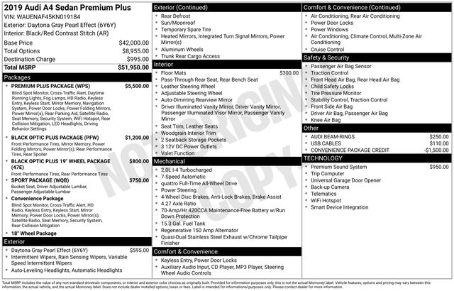 South Fork Chrysler Jeep Dodge Ram is pumped up to offer this superb-looking 2019 Audi A4 in Daytona Gray Pearl Effect. This vehicle has passed our comprehensive inspection and comes with the following features: Odometer is 27724 miles below market average! *All Wheel Drive, Bluetooth, Hands-Free connection, Navigation!, Premium Stereo, Backup Camera, Cruise Control, Keyless Entry, Power Locks, Power Windows, Heated Seats, Leather Seats, Sunroof / Moonroof, Blind-Spot Monitors, Apple Carplay, Android Auto, Black Optic Package, 7-Speed Automatic S tronic, quattro, Black/Red Contrast Stitch Leather, 3-Spoke Flat Bottom Steering Wheel w/S Badge, 4-Wheel Disc Brakes, ABS brakes, Air Conditioning, Alarm System w/Motion Sensor, Aluminum Ellipse Inlays, Audi Advanced Key, Audi Connect PRIME & PLUS, Audi MMI Navigation Plus w/MMI Touch, Audi Virtual Cockpit, Automatic temperature control, Bang & Olufsen Sound System w/3D Sound, Black Cloth Headliner, Black Optic Exterior Package, Black Optic Plus 19" Wheel Package, Black Optic Plus Package, Brake assist, Electronic Stability Control, Front Sport Seats, High-Gloss Black Exterior Mirror Housings, High-Gloss Black Exterior Side Mirrors w/Memory, High-Gloss Black Side Sill Blades & Rr Lip Spoiler, Panic alarm, Piano Black Inlays, Power driver seat, Power moonroof, Power steering, Power windows, Rear window defroster, Red Brake Calipers, Remote keyless entry, Speed control, Sport Package, Sport Suspension, Steering wheel mounted audio controls, Titanium Black Singleframe Grille, Traction control, Wheels: 18" 10-Y-Spoke Gloss Black, Wheels: 19" 5-V-Spoke Design Titanium Finish.