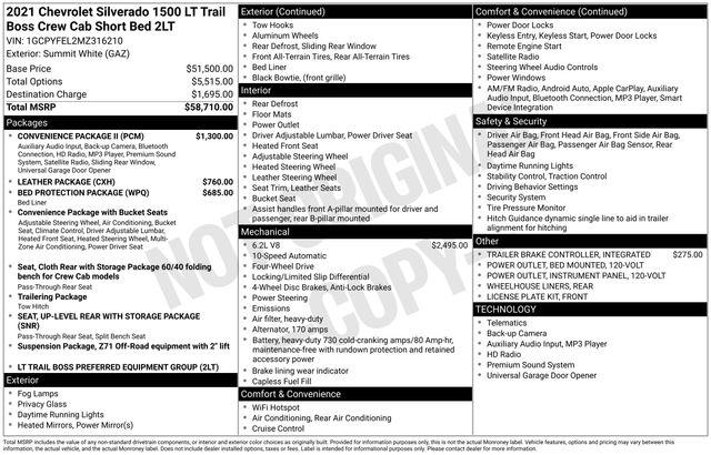 Discover the power and capability of the 2021 Chevrolet Silverado 1500 LT Trail Boss. This rugged and versatile pickup is equipped with an impressive EcoTec3 6.2L V8 engine, delivering 420 horsepower and 460 lb-ft of torque. Paired with a smooth-shifting 10-speed automatic transmission and a capable 4WD system, the Silverado 1500 LT Trail Boss is ready to take on any adventure.