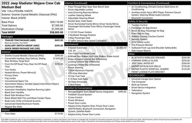 Designed to conquer the toughest terrains, the Mojave features heavy-duty suspension with gas shocks, traction control, and a Jeep Trail Rated Kit, ensuring you can tackle any adventure with confidence. The Auxiliary Switch Group and Trailer Tow Package further enhance the Gladiator's versatility, allowing you to power your gear and haul your toys with ease.