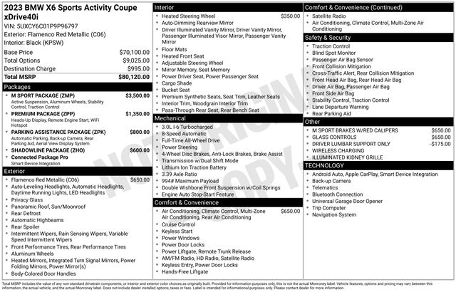 South Fork Chrysler Jeep Dodge Ram is proud to offer this handsome 2023 BMW X6 in Flamenco Red Metallic. This vehicle has passed our comprehensive inspection and comes with the following features: *All Wheel Drive, Bluetooth, Hands-Free connection, Backup Camera, Cruise Control, Keyless Entry, Power Locks, Power Windows, Leather Seats, Sunroof / Moonroof, Collision Avoidance System, Collision Warning Alert System, Adaptive Cruise Control, Blind-Spot Monitors, Lane Keeping Assist, Adaptive Headlights, Automatic Headlights, Apple Carplay, Android Auto, Black Black Sensafin, 10 Speakers, ABS brakes, Active Park Distance Control, Adaptive M Suspension, Aerodynamic Kit, Apple CarPlay & Android Auto Compatibility, BMW Assist eCall, Connected Package Pro, Driver Lumbar Support Only (DISC), M Sport Exhaust System, M Sport Package, M Sport Package (337), M Steering Wheel, Power Liftgate, Power moonroof, Shadowline Exterior Trim, Wheels: 20" x 9" M Star-Spoke Bi-Color (Style 740M), Without Lines Designation Outside.