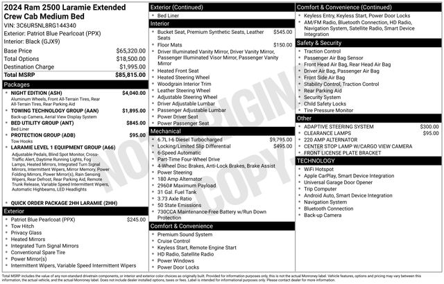 South Fork Chrysler Jeep Dodge Ram is pumped up to offer this outstanding 2024 Ram 2500 in Patriot Blue Pearlcoat. This vehicle has passed our comprehensive inspection and comes with the following features: CARFAX One-Owner. Clean CARFAX. Odometer is 15421 miles below market average! *4WD, Turbo Diesel Power, Bluetooth, Hands-Free connection, Navigation!, Backup Camera, Cruise Control, Keyless Entry, Power Locks, Power Windows, Heated Seats, Leather Seats, Premium Wheels, Towing Package, Blind-Spot Monitors, Apple Carplay, Android Auto, Apple CarPlay/Android Auto, Black Exterior Truck Badging, Black Headlamp Bezels, Black Interior Accents, Black RAM Head Tailgate Badge, Black Tail Lamp Bezels, Black Wheel Center Hub, Blind Spot & Cross Path Detection, Body Color Grille Surround, Gloss Black Grille Billets/Accents, Navigation System, Night Edition, ParkSense Front/Rear Park Assist System, Sport Performance Hood, Wheels: 20" x 8.0" Black Painted Aluminum.